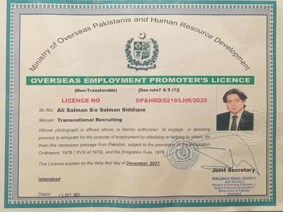 License & Certifications License & Certifications TRG is a government-licensed Overseas Employment Promoter, authorized by the Bureau of Emigration & Overseas Employment, Government of Pakistan. Our license reflects our commitment to ethical recruitment and compliance with international standards.